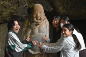 布袋様のお腹を触って、健康でいられますようにとお願い…